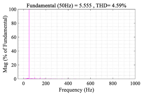 To enhance the generalizability of the experimental results, Figure 17, Figure 18, Figure 19 and Figure 20 present the variations in DC voltage and AC current under Condition 2 (as defined in Table 2), before and after PPB compensation, as well as a comparison of current tracking performance under four different control strategies. As shown in Figure 17a, without PPB operation, the DC-side voltage exhibits significant fluctuations. Likewise, severe distortion appears in the AC current waveform in Figure 17b, indicating that Condition 2 imposes substantial adverse effects on the system in the absence of compensation. Figure 18 illustrates the current tracking performance of the PPB under four control strategies. It can be observed that the proposed method achieves the smallest current ripple and the most accurate tracking performance among all cases. Figure 19 shows the compensated waveforms of DC voltage and AC current after PPB operation. As seen in Figure 19a, the DC bus voltage fluctuates within a narrow range around 500 V, and the three-phase currents in Figure 19b approach ideal sinusoidal waveforms. Finally, Figure 20 presents the FFT analysis of the phase-A current. The total harmonic distortion (THD) is calculated to be 4.59%, which is below 5%, meeting engineering standards.