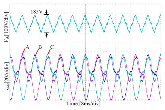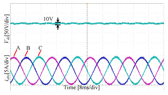 Figure 25 presents the DC-side voltage waveform after the proposed compensation circuit is applied under pulsed load conditions. The DC-side voltage remains within 1% of the reference voltage, indicating effective regulation. Additionally, the three-phase current waveforms shown in the figure closely approximate sinusoidal waveforms after the compensation circuit is introduced, meeting practical engineering requirements.