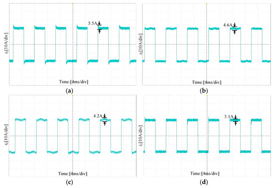 After the power buffer (PPB) is activated, the AC component of the pulsed current is used as the reference, and the switching states of the PPB are controlled accordingly for current tracking. Four control strategies are implemented for comparison, as illustrated in Figure 23. During the reference current steady-state period, by comparing the peak-to-valley difference in the actual current tracking process, it can be observed that when using PI control to track the pulsating current, the actual total current exhibits significant overshoot in each pulse cycle, and the current distribution is uneven, resulting in moderate tracking performance. Under conventional model predictive control (MPC), parasitic parameters lead to a steady deviation between the actual tracking current and the reference signal, along with pronounced disturbances during the tracking process, indicating unsatisfactory performance. When a fixed-gain Luenberger observer is combined with MPC for current tracking, the inability to adaptively adjust the observer’s convergence speed causes large current fluctuations during tracking. In contrast, the proposed control strategy enables uniform current distribution without noticeable overshoot. Experimental results demonstrate that among the four strategies, the proposed method achieves the most accurate current tracking and the most uniform current distribution, confirming its clear advantages over the others.