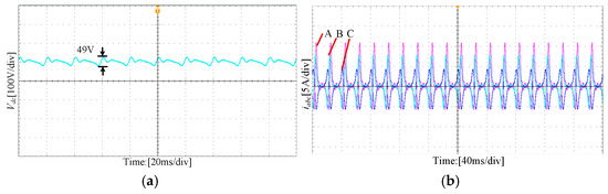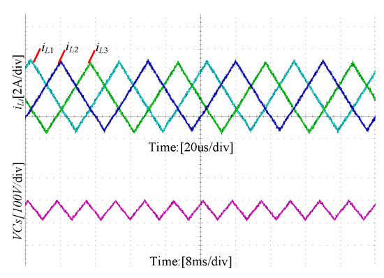 Figure 24 shows the enlarged waveforms of the three-phase interleaved inductor currents under the proposed control strategy. Each phase current is shifted by 120°, achieving effective current sharing. Figure 24 also presents the voltage waveform of the energy storage capacitor during the decoupling process, which varies periodically with the pulsed load cycle, ensuring continuous decoupling of the pulsed power.