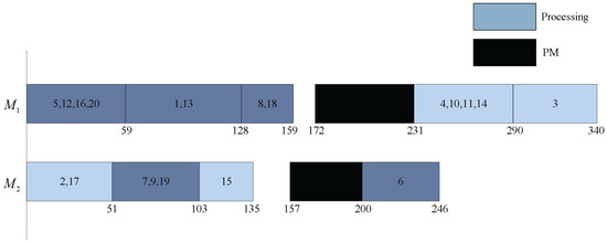 PM is considered. There is a time interval between two consecutive PMs, during which jobs are processed. For , indicates the length of the interval, denotes the duration of PM, and the start time of the g-th PM is , that is, the processing of a job cannot be finished when time reaches, PM will be first handled and then the job is processed.