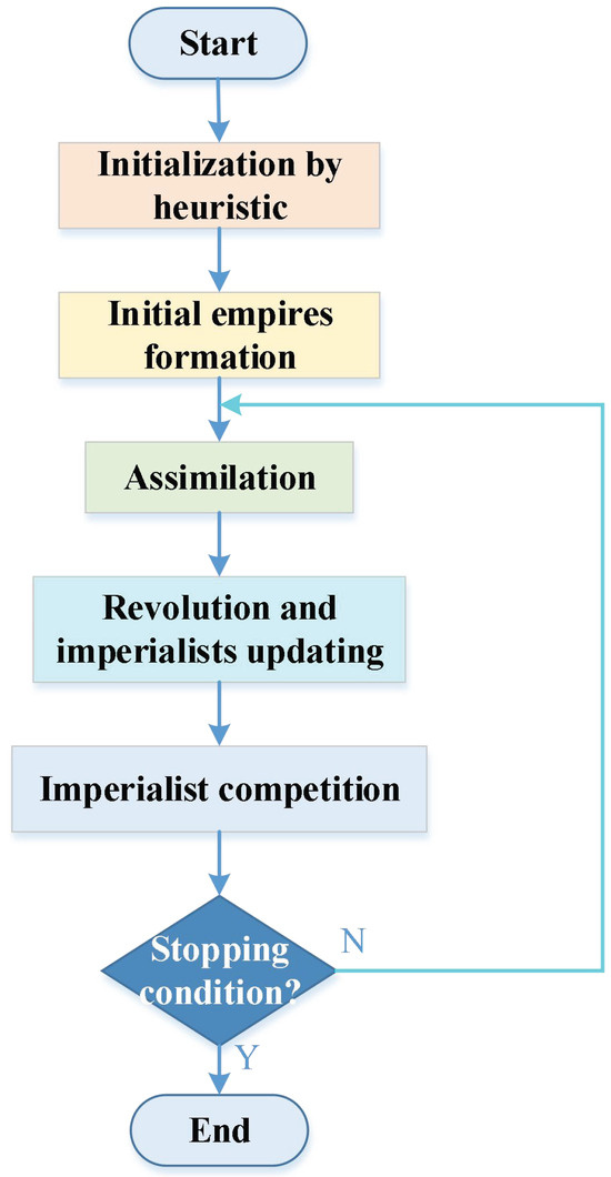 The imperialist competitive algorithm (ICA) is a meta-heuristic illuminated by the historical phenomena of imperialism and colonialism. Unlike the existing meta-heuristics such as GA and SFLA, ICA has good neighborhood search ability, effective global search property, good convergence rate, and flexible structure [46]. In recent years, ICA has been extensively applied to solve various production scheduling problems such as PMSP [47], flexible job shop scheduling [48,49], hybrid flow shop scheduling [50,51], and assembly scheduling [52]; however, ICA is seldom applied to solve parallel BPM scheduling. ICA has successfully been applied to solve PMSP and results revealed that ICA has a strong exploration–exploitation balance and significantly outperforms the best-performing algorithms in the literature. When all machines of PMSP are replaced with BPMs, PMSP is extended to the parallel BPM scheduling problem. The advantages of ICA in solving PMSP show that ICA has a potential advantage in handling parallel BPM scheduling, so ICA is chosen in this study.