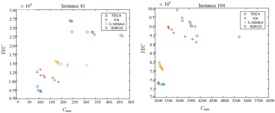 TEICA has the following parameters: , and the stopping condition. In this study, CPU time is adopted as the stopping condition. We found through experiments that TEICA, ICA, C-NSGA-A, and BOACO can reach a stable set of solutions on all instances when the second CPU time reaches , so this CPU time is used as the stopping condition for four algorithms.