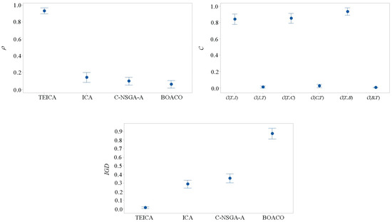 Metric [55] is the ratio of to , where is the non-dominated set of Algorithm l, the reference set consists of the non-dominated solutions in the union of non-dominated sets of all algorithms.