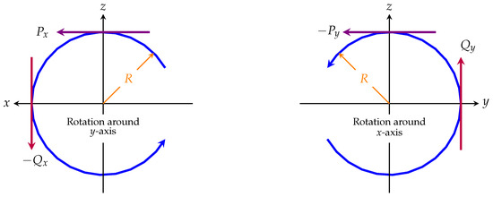 The column vector on the left-hand side is for , and the vector on the right-hand side is for the space where is applicable. Also, the region around the north pole is taken to be small, which appears like a flat surface [35,45]. The matrix on the right-hand side is denoted as and is to be employed for the contraction. Consider the following operations on the rotation generators of Equation (6):