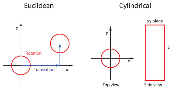 This is, indeed, the Lie algebra for the cylindrical group. We illustrate in Figure 1 why the cylindrical group is isomorphic (onto and one-to-one) to the Euclidean group. They both are based on the surfaces that are tangential to a sphere.