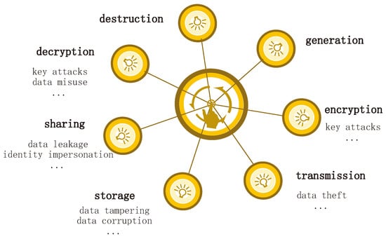 In the data security sharing system, data move through seven stages from the data owner to the data user: generation, encryption, transmission, storage, sharing, decryption, and destruction. In this process, data security faces multiple threats, including key attacks [24], data leakage [25], identity impersonation [26], data theft [27], data tampering [28], data corruption [29], and data misuse [30]. It is important to emphasize that the term ‘data corruption’ as used in this paper not only refers to the alteration of ciphertext in transit, but also includes the compromising of auxiliary elements such as associated indexes, integrity tags, and re-encryption keys cached on the server side. The destruction of any of these components may render the data undecryptable or cause distorted decryption results, thereby threatening the system’s availability and integrity. To better illustrate the real-world impact of these threats in secure data sharing scenarios, this paper presents the following representative cases: