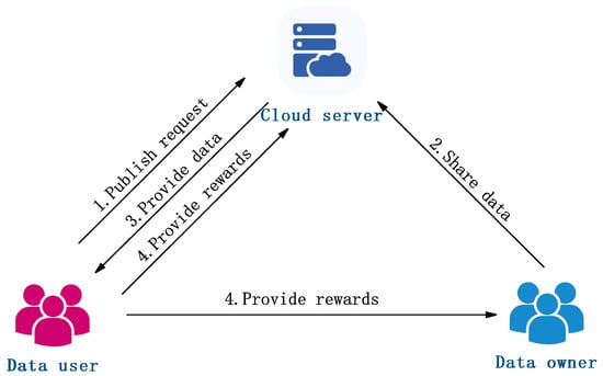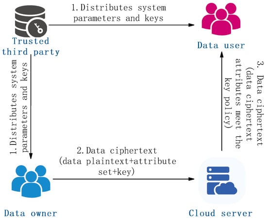 A data secure sharing system model can be summarized as shown in Figure 1, comprising three entities: cloud servers, data owners, and data users. In the healthcare data sharing ecosystem, the data owner refers to the legitimate holder of medical data, typically the patient, who possesses individual health-related records such as electronic medical records. Encryption methods adopt searchable encryption (SE), proxy re-encryption (PRE), attribute-based encryption (ABE), or key agreement. A cloud server, acting as a third-party data custodian, is responsible for the unified integration, centralized management, and access control of the collected medical data. The data user represents the ultimate recipient of the medical data, such as research institutions, who obtain access to the data through legitimate authorization for the purposes of scientific research or technological development. In this model, the data owner stores the plaintext data and, in order to ensure secure data sharing, encrypts the data before uploading it to the cloud server. The cloud server provides services such as storage and retrieval for secure data sharing. It stores the encrypted data uploaded by the data owner. When a data user requests the encrypted data from the cloud server, the server returns the encrypted data to the user. Once the data user determines which data to download from the data owner, they download the encrypted data from the cloud server, decrypt it, and obtain the plaintext data.