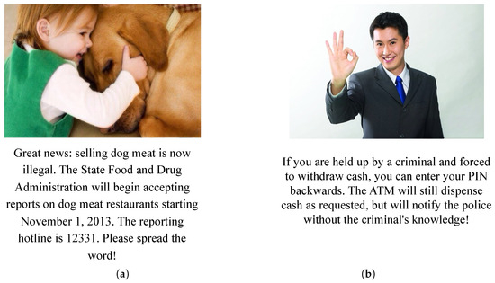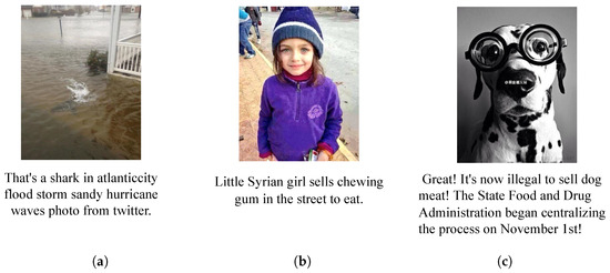The widespread adoption of the internet and social media platforms has enabled people to access information more efficiently and disseminate it more rapidly [1,2]. In recent years, the spread of fake news and misleading information has reached unprecedented levels of complexity and prevalence, with multimodal content (especially text–image combinations) increasingly becoming the primary means of information dissemination online [3]. However, this trend has also created favorable conditions for the proliferation of fake news. Illegal information disseminators combine carefully designed text with misleading visual content, exploiting the apparent coherence of multimodal information to mask its underlying inconsistencies, thereby enhancing the deceptive nature of the information [4]. As shown in Figure 1, the text information in (a) does not match the image description, and the image is easily identifiable as a forgery. In (b), the text describes the tragic living conditions of the little girl, while the image shows the little girl smiling. In (c), the text and image descriptions share a similar subject but differ in details. The text information about “selling dog meat being illegal” contrasts with the image showing a dog wearing large-framed glasses, further highlighting its nature as fake news. According to research from the Massachusetts Institute of Technology (MIT) [5], fake news spreads six times faster than real news on social media and has a more far-reaching impact. This phenomenon not only reflects the severe challenges in current online information ecosystem governance but also indicates that developing efficient and robust multimodal fake news detection technology has become a crucial breakthrough for enhancing information credibility and ensuring online content security.