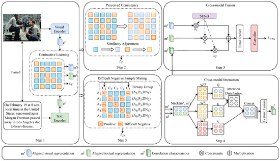 In recent years, with the rapid development of large-scale multimodal pre-trained models, cross-modal alignment and contrastive learning have gradually become important development directions in the field of multimodal fusion [26]. Contrastive learning, as a self-supervised learning framework, constructs positive and negative sample pairs and optimizes the similarity distribution in the feature space, enabling the effective learning of discriminative representations. The model optimizes the alignment of image and text features by symmetrically pulling positive sample pairs closer and pushing negative sample pairs further away. This framework has achieved significant results in computer vision and natural language processing, particularly in cross-modal understanding tasks, providing a new technical approach for multimodal fake news detection. The CLIP model proposed by Radford et al. [27] uses contrastive learning for pre-training on 400 million image–text pairs, achieving precise alignment in the cross-modal semantic space, laying an important foundation for subsequent research. The ALIGN model developed by Jia et al. [28] further demonstrates that contrastive learning can maintain stable feature learning capabilities even on large-scale noisy data (over 100 million image–text pairs). These breakthroughs have driven the development of contrastive learning in the multimodal domain.