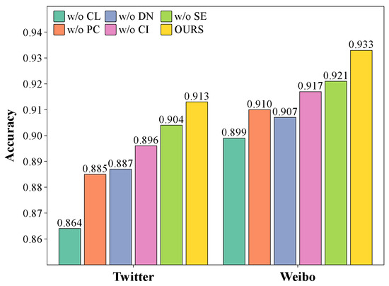 Removing contrastive learning (w/o CL) leads to a significant decrease in model performance, with a decrease on the Twitter dataset and a decrease on the Weibo dataset. This result clearly indicates that the contrastive learning mechanism plays a crucial role in aligning multimodal feature representations.