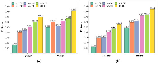 Observations reveal that the model’s performance decline on the Twitter dataset is generally greater than on the Weibo dataset. This phenomenon may be attributed to the presence of a large number of tweets associated with a single event in the Twitter dataset, which to some extent limits the model’s ability to learn broad feature representations. In contrast, the Weibo dataset, being larger in scale, provides more abundant training samples, mitigating the impact of data noise.