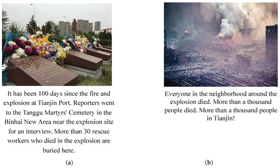 Case Group 2: Identifying Fine-Grained Differences Within the Same Event. Figure 7a,b both relate to the same real-world event—the Tianjin Port explosion. Figure 7a includes accurate textual information with verified casualty counts and a respectful image of the cemetery. Figure 7b, however, contains vague and emotionally charged language (e.g., “all nearby residents died,” “1000+ casualties”) and uses an image that, while visually related, was not taken at the verified scene.
