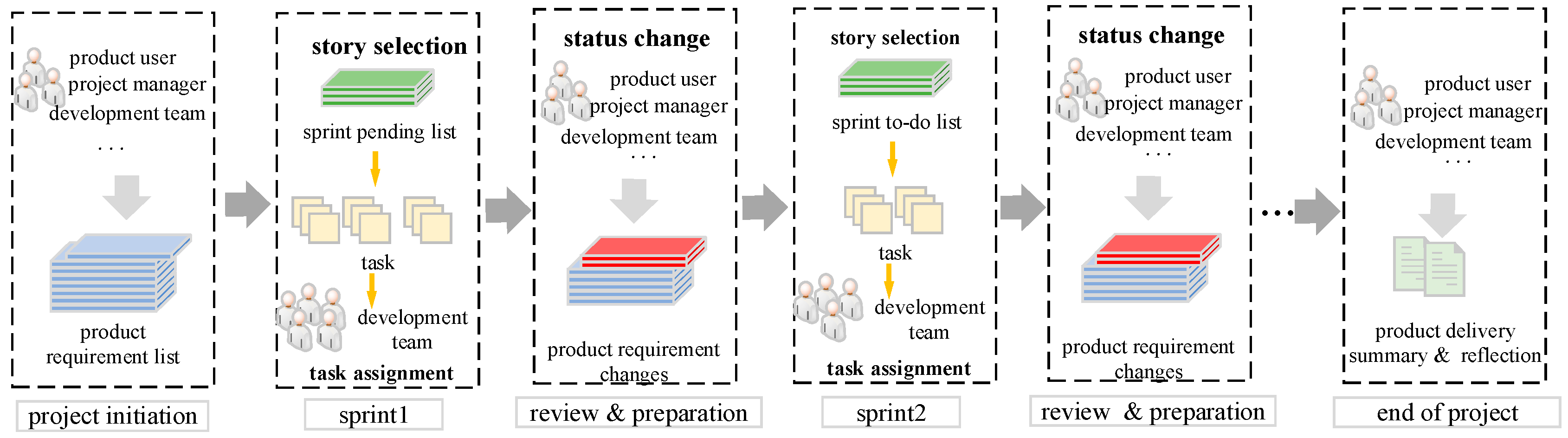 In summary, there are still some problems with the existing studies on the ASPS model. First, the characteristic of periodic development in each sprint of the agile project was not reflected in the existing models. Second, during the process of real-world agile development, changes in user requirements and employees’ or user stories’ attributes often occur, while the existing models did not account for such dynamic factors. Third, the existing models only optimized the resource allocation problem, while the actual ASPS involves multiple coupled sub-problems. Last, the existing research has not considered the situation that complex agile software projects need to be completed through multi-team collaboration. In order to overcome the above difficulties, we establish a dynamic periodic multi-team agile software project scheduling model named MTASPS, which focuses on three tightly coupled sub-problems.
