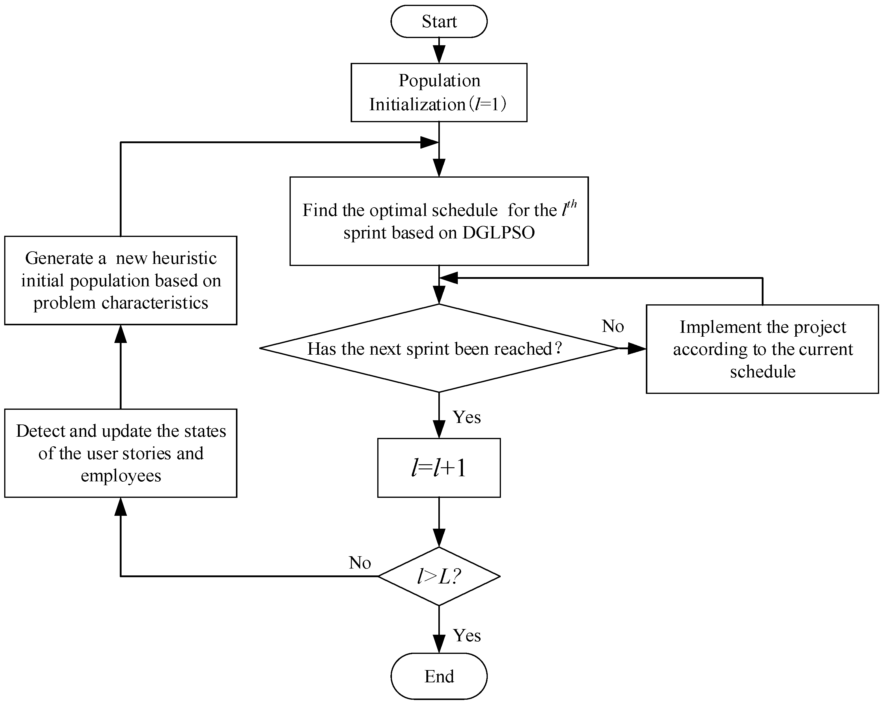 Step 2: Determine whether the next sprint has been reached. If not, execute the project according to the current schedule. If yes, let l = l + 1, then detect and update the states of user stories and employees at the beginning of the lth sprint through the sprint retrospective and sprint review mechanisms. All the states serve as inputs to DGLPSO. After that, generate a new heuristic initial population based on domain knowledge and obtain the optimal schedule for the sprint by DGLPSO.