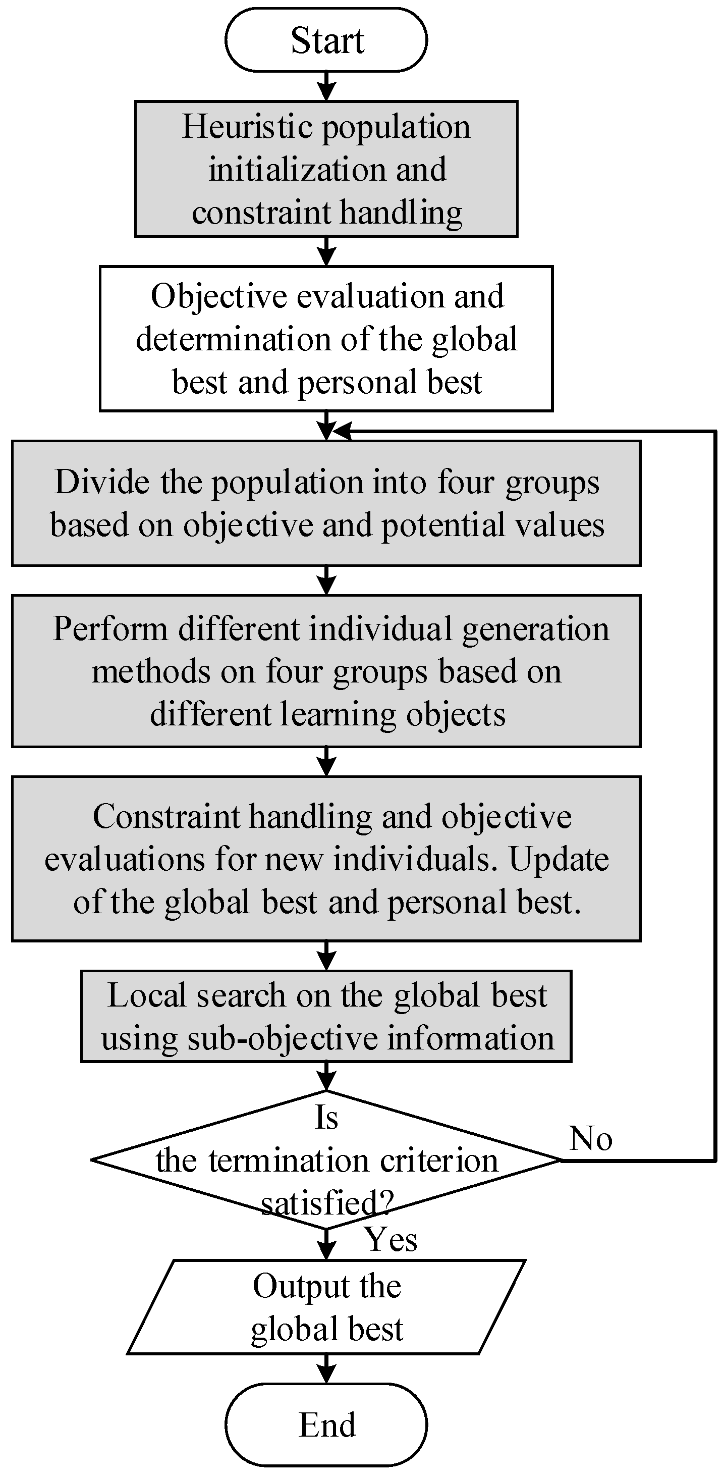 Figure 3, where the new strategies are marked in gray. The algorithm consists of seven steps: (1) Initialize the population by heuristic information and handle the constraints. (2) Evaluate the objective values and obtain the personal best and the global best. (3) Divide the population into four subgroups based on the objective values and potential values. (4) Update the individuals by selecting different learning objects for different subgroups. (5) Perform constraint handling and objective evaluation on the updated individuals and update the personal and the global best. (6) Conduct local search on the global best by the knowledge derived from the sub-objectives. (7) Check the termination criterion.