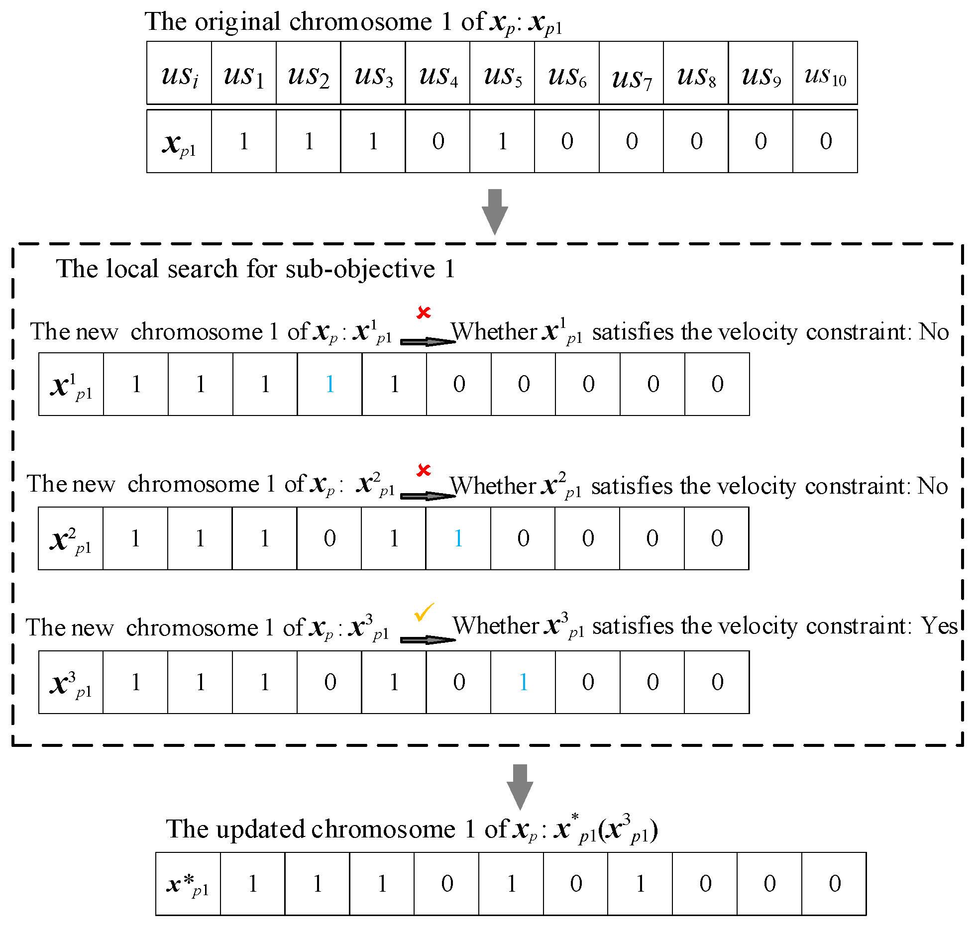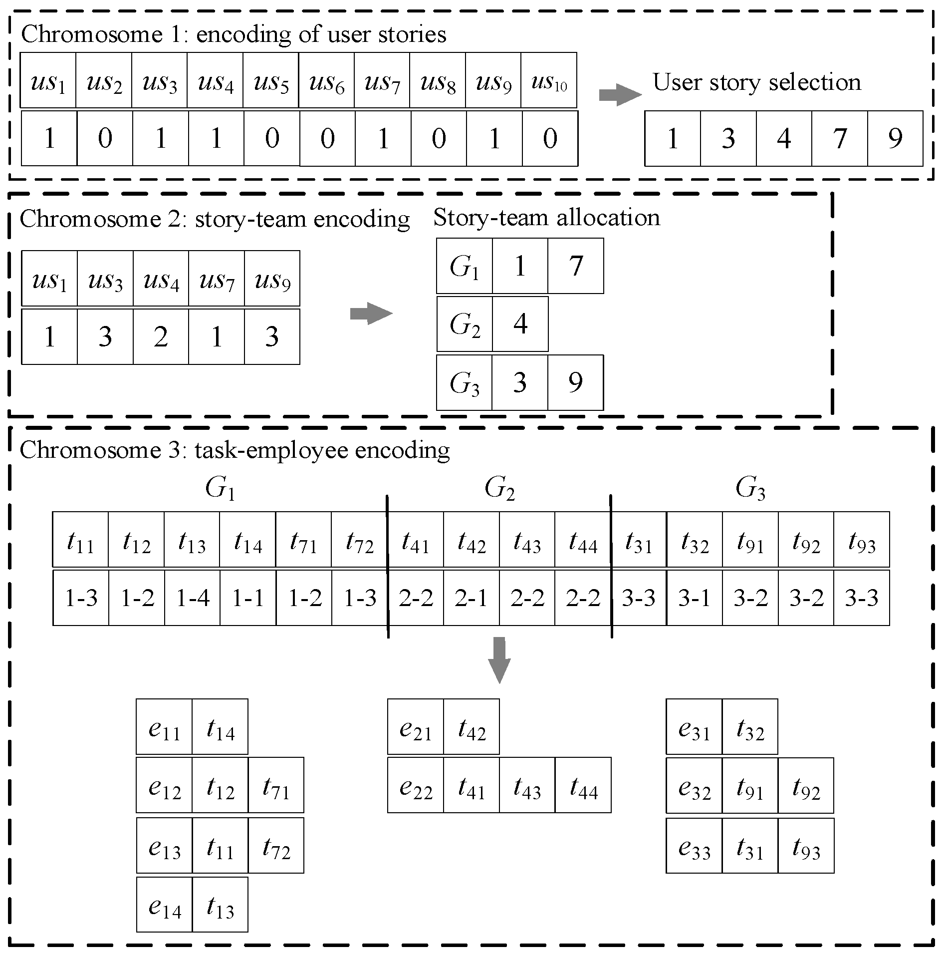 Figure 4 has ten initial user stories and three teams. The number of employees in each team is four, two, and three, respectively. Chromosome 1 encodes the user stories by a 0/1 string, with “1” and “0” indicating selection or non-selection of the corresponding story. The length of chromosome 1 is the number of initial user stories