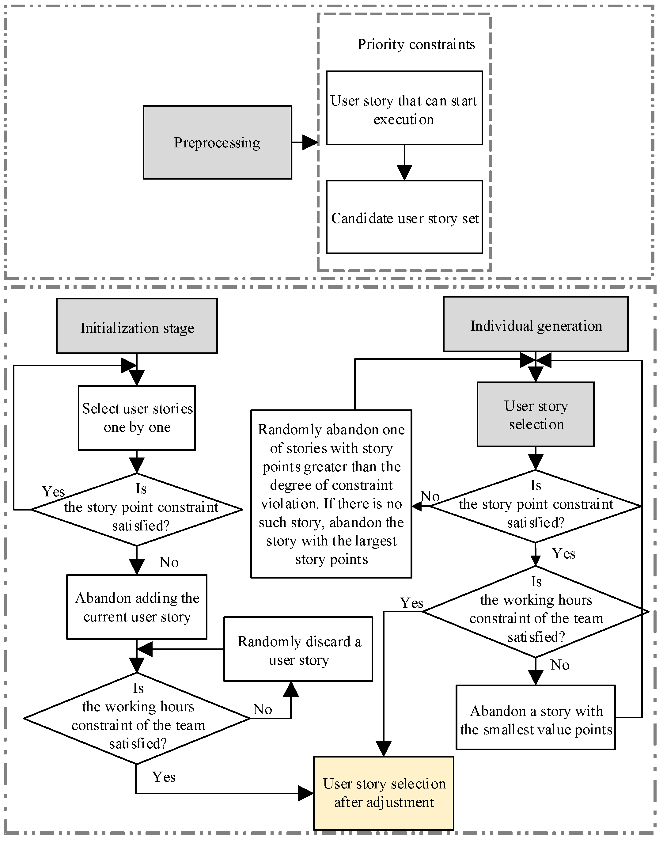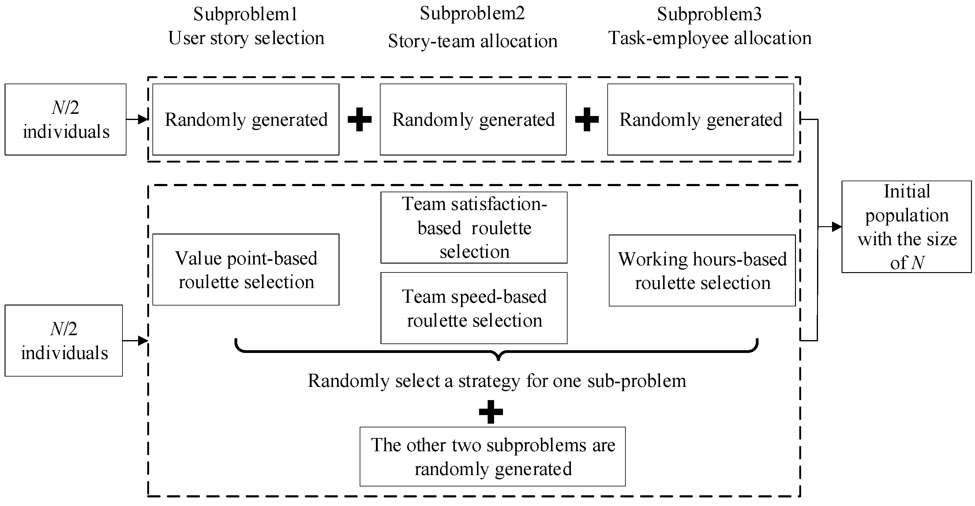 16] constructed a multi-objective hybrid model based on the Scrum framework and employed two multi-objective evolutionary algorithms named NSGA-II and SPEA2 for solving it. However, the hybrid model failed to address the allocation of user story-decomposed tasks to employees and ignored dynamic factors like user story insertion or removal. Consequently, the resulting schedule exhibits limited adaptability to real-world dynamics.