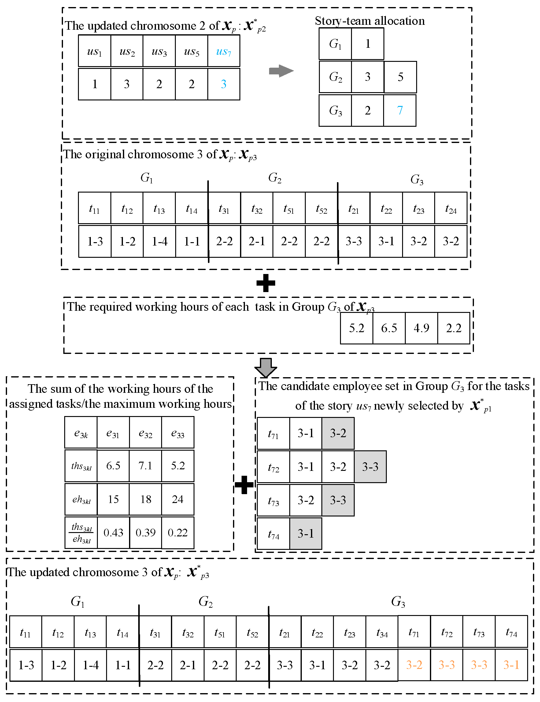 G3, its task–employee allocation is kept unchanged. From this, we can obtain the sum of task durations