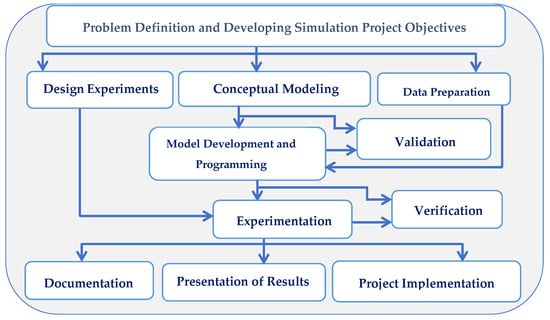 DES as an OR technique is used to solve complex dynamic problems where exact analytic and mathematical methods are problematic or not feasible [,,]. It often involves “experimentation on a computer-based model” of a replica system, the model acting as a “vehicle for experimentation” based on a “what if” scenario and other statistical design techniques [,,]. Figure 1 presents DES modeling activities, tasks, and processes.