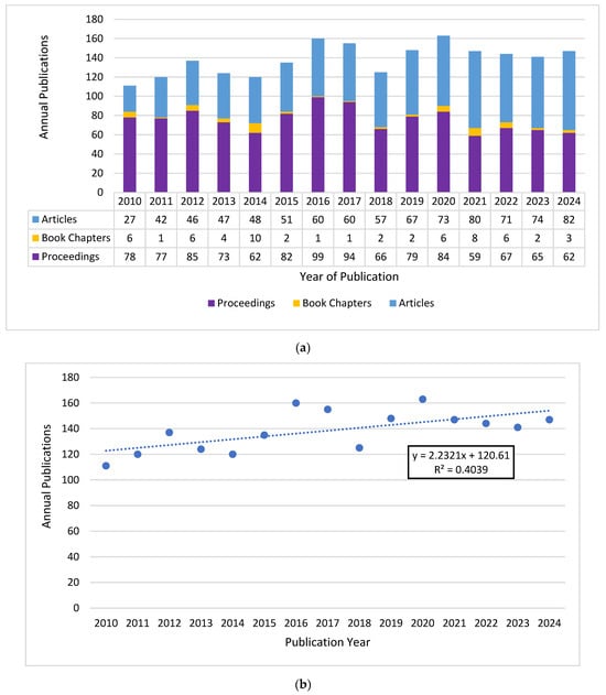(a) Annual scientific publications on discrete-event modeling and simulation. (b) Linear trend of the scientific publications on evolutionary expansion of discrete-event modeling and simulation (2010–2024).