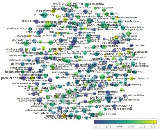 Similarly, terms such as “industry 4.0,” “digital twin” (DT), and “COVID-19” being among the prominent themes indicates the continuous relevance of DES in tackling problems in emerging fields and technologies in the fourth industrial revolution and disease outbreak, such as the “SARS coronavirus-2” (SARS-CoV-2) [].