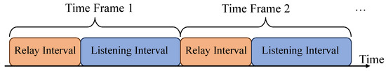 Each relay interval was defined as a short time unit in which only one data transmission could be completed, while the listening interval was defined as a time unit capable of receiving all data sent within the same time frame. Since the communication model assumed sufficient frequency resources among UAVs and no mutual interference, it was feasible to assume that multiple UAVs could transmit simultaneously and that the receiving UAV could process all of them during the listening interval. A time frame was a very short duration, during which the channel condition was assumed to remain constant [31]. For instance, under the 802.11n protocol, the total delay for transmitting a 1 KB data packet was approximately 0.2 ms. Even when accounting for contention and data rate fluctuations, the duration of a single time frame could still be considered less than 1 ms.