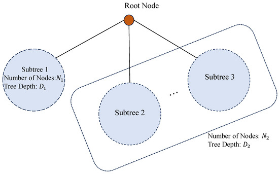 To analyze the scheduling time, we consider any non-leaf node p in the tree as the root (see Figure 2). Node p connects multiple subtrees. Let Subtree 1 be the deepest subtree with depth and node count , and let Subtrees 2 to n together have node count and maximum depth . Since all data transmissions between these subtrees must pass through node p, p serves as a critical relay. After p finishes forwarding all data packets in time frames, additional scheduling time is required for packets to reach the leaf nodes of its subtrees.