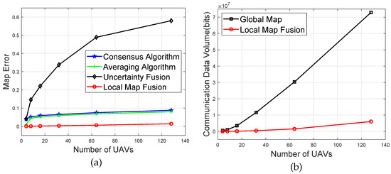 The results of map deviation after fusion are shown in Figure 3a. We compared the map differences after fusion for different algorithms under 4, 8, 16, 32, 64, and 128 UAVs. As shown in the figure, regardless of the algorithm used, the map deviation increased as the number of UAVs grew. This indicated that achieving consistent map fusion became more difficult with larger UAV swarms. Among the evaluated methods, the uncertainty-based fusion algorithm performed the worst, while the averaging algorithm and consensus-based fusion yielded similar results. Our proposed method outperformed all others. The reason lies in the fact that the three baseline algorithms all performed fusion based on the global probability map. In each update step, the detected target information could only be propagated to neighboring UAVs and could not spread across the entire network. This resulted in delayed information transmission over multi-hop UAV links. As the network size increased, the map inconsistency between UAVs also became larger. Compared to the uncertainty-based fusion algorithm, both the consensus and averaging algorithms tended to converge the detected grid probabilities toward the mean. Since the initial probability map was uniformly distributed (i.e., all grid cells had the same initial probability), the probability differences between UAVs after detection remained small, and the spread of detection events among neighbors was more gradual. In contrast, our proposed method broadcasted the local observation map across the entire network, so that in a single update step, all UAVs could access global information. This enabled the network to achieve globally consistent map fusion, demonstrating the superiority of our method in maintaining consistent situational awareness. The communication overhead for each algorithm is shown in Figure 3b. We assumed that each data point was encoded as a 32 bit, single-precision, floating-point number. Only the communication cost for transmitting maps was considered, while the fixed overhead of communication protocols was ignored.