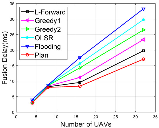 To evaluate the performance of the proposed routing planning algorithm, we compared the fusion delays of different algorithms within the local observation map fusion framework presented in this paper. Each local observation map only contained the offset parameters along two axes and the grid data within the sensing range, resulting in a data size of less than 1 KB. Therefore, we assumed that each time frame corresponded to 1 ms. We ignored the algorithm’s processing time and defined fusion delay as the product of the optimal number of routing time frames and the duration of a single time frame.