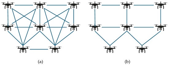 Typical UAV network topology diagram with 8 UAVs. (a) Dense connectivity: 20 edges. (b) Sparse connectivity: 11 edges.