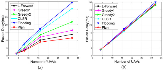 We further conducted experiments on networks with different connectivity densities. In this experiment, we varied the node density when randomly generating UAV positions, resulting in different levels of sparsity in the resulting connected graphs. The number of edges in networks with varying connectivity densities is shown in Table 2 and the typical network topology diagrams under different connectivity densities with eight UAVs are shown in Figure 5. The comparison of fusion delays are presented in Figure 6. In densely connected networks (Figure 6a), the proposed dynamic routing algorithm significantly reduced map fusion delay compared to the baseline algorithms, and the performance improvement became more pronounced as the number of UAVs increased. This was because densely connected networks typically contained multiple distinct routing paths for data transmission, which placed higher demands on cooperative routing among nodes. Algorithms such as OLSR and flooding did not account for cooperative forwarding between nodes, leading to poor performance. Greedy algorithms partially considered cooperative routing but only made single-step optimal decisions, lacking the capability for multi-step prediction, which limited their effectiveness.In contrast, the L-forward approximation algorithm considered node cooperation within a limited prediction horizon, which helped reduce fusion delay to some extent. However, in sparsely connected networks (Figure 6b), our proposed algorithm did not significantly improve map fusion delay. This was because in sparse networks, some node pairs were connected by only a single unique routing path. The nodes along these paths became critical and formed performance bottlenecks. In such cases, complex cooperative routing is unnecessary, and even simple strategies can produce reasonably good forwarding schedules, resulting in similar fusion delays. Overall, our dynamic routing planning algorithm for reliable map fusion is more suitable for networks with relatively dense communication connectivity, under which the algorithm achieves better symmetry in fusion latency between lossless and lossy transmission scenarios.