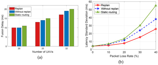 The results, shown in Figure 7b, were obtained under a more challenging condition, with the UAV swarm size increased to 32 nodes. The findings reveal that the proposed dynamic routing replanning method consistently achieved the lowest latency standard deviation, indicating superior delay symmetry and load balancing across the network. In contrast, the static routing baseline exhibited significantly worse performance in terms of latency symmetry. Although it showed slightly more stable transmission delays compared to the non-replanning baseline under low packet loss conditions, its lack of adaptability under high-loss and large-scale network conditions led to severe degradation, with certain UAV nodes experiencing extreme delays due to fixed paths being blocked or congested. As a result, the latency standard deviation increased sharply, indicating poor load balancing.