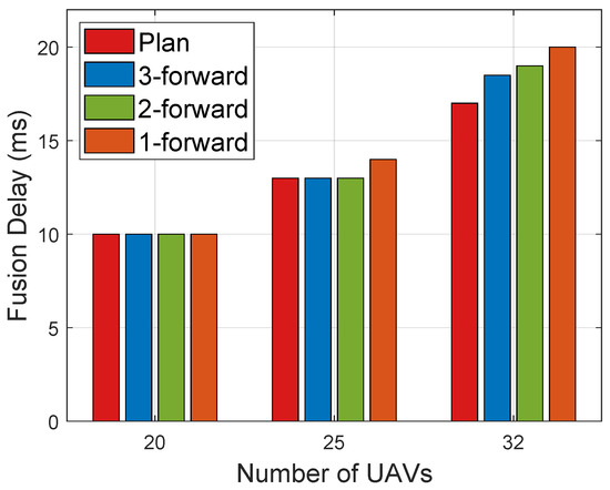 In addition to overall fusion delay, we further analyzed latency symmetry among UAVs by calculating the standard deviation of node-level transmission completion times under different conditions. Specifically, the latency standard deviation () was computed using the following formula: