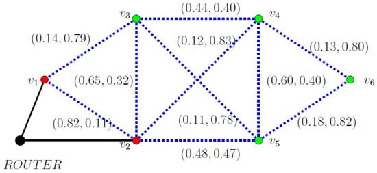 Let . Then, . Thus, by Definition 19, is an for the network shown in Figure 11.
