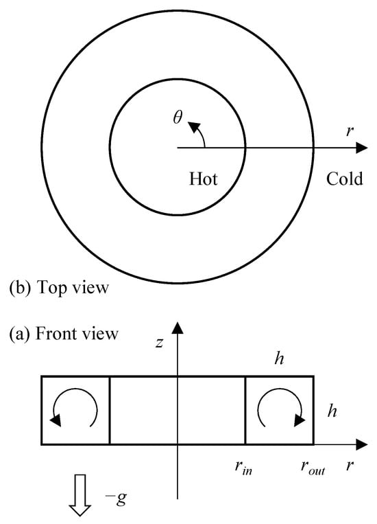 Figure 1 presents a schematic model discussed in this study. This model represents one of the simplest geometries for circulation structures in thermal transport devices using liquid metals. A cylindrical coordinate system is employed for this annular enclosure, which has a square cross-section with a side length of h. The radii from the coordinate origin to the inner and outer walls of the annulus are represented as rin and rout, respectively. The radius ratio is defined as κ = rin/rout. In this study, the radius ratio κ was fixed at 0.5 to maintain consistency with previous studies and the relevant literature. This value provides a balanced geometry in which both vertical and radial temperature gradients can develop clearly. Such a configuration is widely used in experimental and numerical investigations of annular enclosures, making it a representative choice for studying natural convection phenomena. The annular container is placed horizontally and filled with a low-Prandtl-number fluid (Pr = 0.025), subject to a uniform gravitational field. The fluid is assumed to be a typical liquid metal, such as molten iron, mercury, or gallium. The inner cylindrical wall of the container is heated, while the outer wall is cooled, with both walls maintained at constant temperatures. The top and bottom horizontal walls are thermally insulated. As a result of the interaction between gravity and the fluid’s density difference, buoyancy forces drive natural convection. The list of symbols is provided at the end of this manuscript.