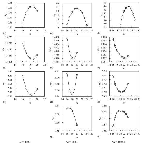 The choice of m in the quarter-circle region was influenced by factors such as grid resolution, convergence criteria, and initial disturbances. For example, at three Rayleigh numbers (Ra = 8000, 10,000, and 12,000), the convergence threshold was varied in increments of 10−8—specifically set to 1.00 × 10−6, 1.01 × 10−6, 1.02 × 10−6, and 1.03 × 10−6. In these tests, parallel computation was not employed. For Ra = 8000, all conditions resulted in convergence to m = 20. However, for Ra = 10,000 and Ra = 12,000, the flow converged to either m = 20 or m = 24, depending on the specific convergence condition. Similarly, when the SOR method was used as the iterative solver for Ra = 10,000, the solution again converged to either m = 20 or m = 24, indicating sensitivity to the numerical setup.