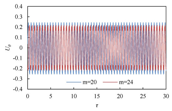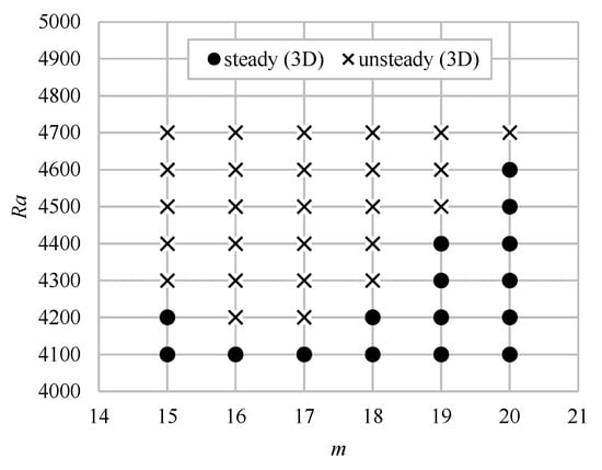 Furthermore, the transition point from steady to unsteady three-dimensional flows varied with m. Figure 3 illustrates the amplification or attenuation of the temporal fluctuations in Uθ for 4100 ≤ Ra ≤ 4700 and 15 ≤ m ≤ 20. The temporal variation of Uθ is based on the value at a specific point at the center of the enclosure. At Ra = 4200, both m = 16 and m = 17 exhibited unsteady flows, but the amplitude was larger for m = 16. Therefore, among the integer values of m, the critical Rayleigh number for the transition from steady to unsteady flow is lowest at m = 16. Based on the behavior shown in Figure 3, the critical Rayleigh number for the onset of oscillatory convection under the present configuration (Pr = 0.025, κ = 0.5) is estimated to be approximately Ra ≈ 4000–4200. In practical systems, this threshold can vary depending on geometry, boundary conditions, and material properties. In Figure 3, all initial conditions are uniformly set to zero.