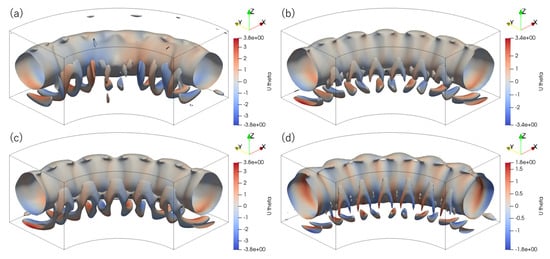 For Ra ≥ 5000, the initially regular, small-scale disturbance structures collapsed, giving rise to irregular three-dimensional oscillatory flows that lacked both spatial and temporal regularity. In the full-circle region, this irregularity persisted even after sufficient simulation time, showing no tendency to transition into a regular pattern. To estimate the number of dominant disturbances M in such flows, the peaks of the azimuthal velocity Uθ were visually counted using contour plots, as shown in Figure 8. In this estimation, each peak was counted as M = 0.5. Consequently, the estimated values of M for these irregular oscillatory flows were not always integers and were frequently evaluated as multiples of 0.5. The resulting flow structures, as shown in Figure 8, demonstrated a twisted configuration in which both the temporal and spatial phases were offset by half a wavelength. For Ra = 5000, 6000, and 10,000, the dominant azimuthal wavenumbers during the disturbance amplification stage were approximately m ≈ 20, 22, and 24, respectively. However, following the transition to irregular oscillations, the number of dominant disturbances M became less well-defined and exhibited fluctuations. Specifically, M varied within the ranges M ≈ 20–21, 18.5–19.5, and 21.5, for Ra = 5000, 6000, and 10,000, respectively.