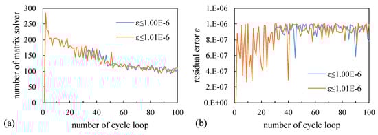 Comparison between the convergence criterion ε ≤ 1.00 × 10−6 and 1.01 × 10−6 in a quarter region at Ra = 10,000. (a) number of matrix solver; (b) residual error.