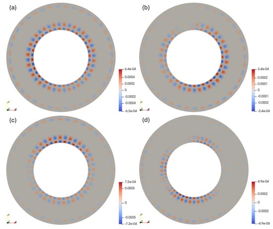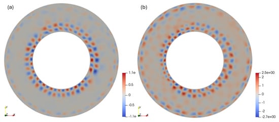 In the full-circle region with Lθ = 2π, the dominant azimuthal wavenumber during the disturbance amplification process was approximately m ≈ 19, 20, 20, 20, 22, and 24 for Ra = 4000, 4300, 4600, 5000, 6000, and 10,000, respectively. These wavenumbers closely corresponded to the integer m values that yielded the maximum SR in the LSA. However, as illustrated in Figure 6, the azimuthal wavenumber distributions were not uniform. As m is not restricted to integer—as long as the total azimuthal wavelength sums to 2π—multiple disturbance modes with different m values can coexist within the domain. This nonuniformity in the wavenumber became more pronounced with increasing Ra.