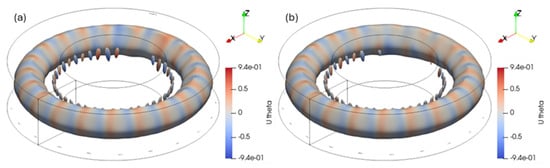 These irregular oscillations in the full-circle region are triggered by the nonuniformity of the azimuthal wavenumber (as seen in Figure 6) and the temporal discrepancies in the growth phases. Such nonuniformities are present even at the initial microscopic stage, before amplification begins, and arise within the error margin of the continuity equation. However, if this error tolerance is set too strictly, the disturbances become too small to grow. In this study, the residual for the continuity equation was set at 10−6, but when reduced to 10−9, the transition from two-dimensional to three-dimensional flow did not occur. Therefore, it is considered impossible to obtain a three-dimensional, single-periodic oscillatory flow in the full-circle region, at least when starting from a zero initial condition.