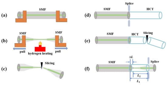 Schematic illustration of the symmetry-optimized FPI micro-cavity: (a) taper preparation, (b) taper processing, (c) taper fibre cutting, (d) precise fusion splicing of HCT and SMF, (e) Insertion of taper fibre end face into HCT, (f) fusion splicing of HCT and taper fibre.