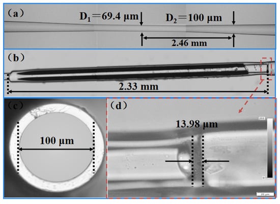 The critical step enabling the centered waist-inserted assembly is the symmetric cleaving of the tapered fiber section. This process involves precisely cleaving the tapered fiber from both sides simultaneously along planes perpendicular to the fiber axis. This symmetrical removal of material is fundamentally important for two reasons: (1) It ensures the geometric center of the tapered waist region is accurately located relative to the cleaved endfaces. (2) It guarantees that the structural properties are identical on both sides of the waist centerline. This enforced geometric symmetry is essential for achieving the precise alignment required when inserting the waist into the capillary tube to form the FP cavity, and it underpins the sensor’s subsequent balanced response to thermal and mechanical stimuli. These geometric and structural symmetries are directly reflected in key parameters that can be quantitatively evaluated through optical microscopy images at different magnifications. Figure 2a (4× magnification) demonstrates the high symmetry of the tapered fiber, with a measured waist diameter of 69.4 μm. The axial distance from the waist to the 100 μm diameter position is 2.46 mm, indicating uniform taper geometry crucial for balanced force distribution. Figure 2c (40× magnification) confirms that the HCT inner diameter (100 μm) exceeds the fiber waist diameter (69.4 μm), providing symmetric clearance for coaxial insertion and minimizing lateral contact forces. Figure 2b (20× magnification) displays the total length of the HCT. This length equals the cantilever beam length, with L1 = 2.33 mm. The longer effective length enhances the FPI’s strain sensitivity by increasing mechanical deformation under strain. In Figure 2d (40× magnification), the FP cavity’s actual length is 13.98 μm, a key parameter for the interferometric effect. Figure 2d (40× magnification) shows the actual length of the FP cavity, ΔL = 13.98 μm, a critical parameter influencing the interferometric effect.