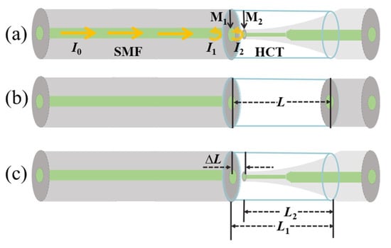 where A stands for the fiber’s cross-sectional area, and E signifies the Young’s modulus of the fiber material. As illustrated in Figure 3c, the capillary-taper-integrated FPI micro-cavity exhibits m-th-order interference peak wavelength shifts governed by the following []: