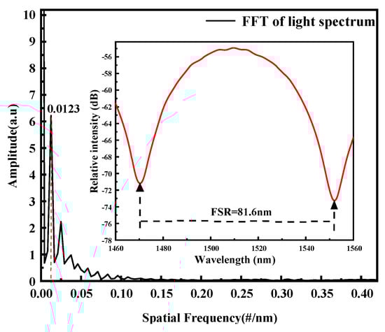 Figure 4 depicts spectral and Fast Fourier Transform (FFT) responses of the symmetry-optimized FPI micro-cavity within the 1460–1560 nm wavelength range. According to the inset in Figure 4, λm = 1470.2 nm and λm+1 = 1551.8 nm can be observed at the wavelength of 1510 nm. This indicates the presence of distinct cosinusoidal fringes with an FSR of 81.6 nm, which is very close to that of 81.59 nm calculated by Equation (3). For validation, the FSR spectra are transformed via Fast Fourier Transform (FFT) into spatial frequency spectra. According to the Fourier principles, the resulting frequency response relates inversely to FSR. Figure 4 shows a singular dominant frequency component with a frequency of f = 0.0123 nm−1, confirming that the sensing structure is characterized by two-beam interference. In other words, the reflection spectrum displays the cosine characteristics required for two-beam interference.