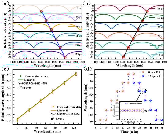 The fixture is designed to stabilize the symmetry-optimized FPI micro-cavity on a 3D moving platform and maintain it in a stretched configuration during the initial phase. The reflectance spectra are obtained within the range of 0 to 125 με by incrementally rotating the knob of the 3D moving platform. The strain characteristics of the sensing FPI are measured by the device shown in Figure 4. Figure 6a shows the variation in the dip in the FPI spectrum with tensile strain. As the strain increases from 0 to 125 με, the dip wavelength in FPI shifts significantly to the right, with a drift of up to 68.0 nm. Figure 6b reveals that the valley wavelength moves notably leftward when the axial strain is reduced from 125 to 0 με, exhibiting a drift as large as 67.9 nm. Notably, a 150 με strain would cause 81.6 nm drift (causing spectral overlap), hence the 125 με limit. Figure 6c exhibits the fitted association between dip wavelength and strain. For forward strain, the FPI sensitivity measures 544.57 pm/με alongside a linearity of 0.9946; in contrast, reverse strain yields a sensitivity of 543.54 pm/με with a linearity of 0.9949. Both sensitivity values demonstrate a superior linear relationship and are closely matched, attesting to the sensor’s excellent reproducibility and reversibility.