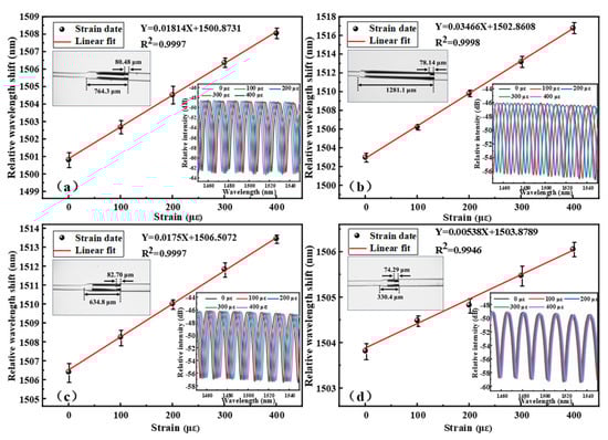 Strain sensitivity and structural comparison of fiber sensors: (a) sensor with 80.48 μm cavity/764.3 μm HCT, (b) sensor with 78.14 μm cavity/1281.1 μm HCT, (c) sensor with 82.70 μm cavity/634.8 μm HCT, and (d) sensor with 74.29 μm cavity/330.4 μm HCT.