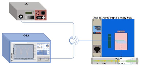 The temperature measurement system for the symmetry-optimized FPI micro-cavity is shown in Figure 8. An SC with a wavelength range of 450–2500 nm is employed in conjunction with an OSA to obtain the reflection spectra. The light reflected from the symmetry-optimized FPI micro-cavity is captured by the OSA with a 3 dB ring coupler to obtain the interference spectrum. In the temperature test experiment of the strain sensor, the sensing component of the FPI fiber is securely affixed to the central stage of a far-infrared rapid-drying oven using high-temperature adhesive tape.