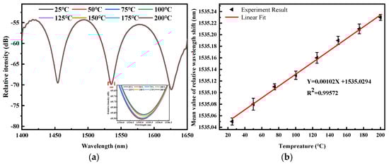 As shown in Figure 9a, the temperature is incrementally raised from 25 °C to 200 °C in intervals of 25 °C, and the corresponding interference spectra are recorded at each specified temperature. As the temperature increases, the dip wavelength of the symmetry-optimized FPI micro-cavity shows minimal sensitivity to temperature variations due to the relatively small thermo-optical and thermal expansion coefficients of air and quartz fiber, as shown in the inset. Moreover, the reflectance spectra show consistent stability with temperature, suggesting that the sensing properties are not influenced by thermal expansion. Figure 9b presents the linear fit pertaining to temperature. The temperature response is derived from the wavelength shift observed through the trough. The strain sensor shows a temperature sensitivity of 1.02 pm/°C and a cross-sensitivity to temperature of 0.0019 µε/°C. The results reveal that the sensor’s temperature cross-sensitivity is extremely low and negligible, thereby minimizing measurement errors caused by temperature fluctuations.